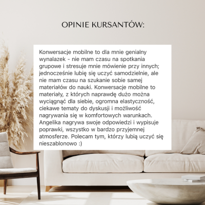- Dostajesz te same materiały co na kursach konwersacji – nowe, autorskie ebooki na wciągające tematy.