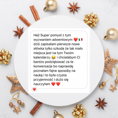 Często piszecie, że chcecie uczyć się regularnie włoskiego, ale nie wiecie od czego zacząć. Na moim Instagramie codziennie uczę Was nowych słówek i podaję linki do KONKRETNYCH treści. W ten sposób miło spędzamy czas w oczekiwaniu na święta i uczymy się ciekawostek o Włoszech i języku. Nie jesteś w tym sam/a, bo uczymy się wszyscy razem, codziennie robiąc to samo.